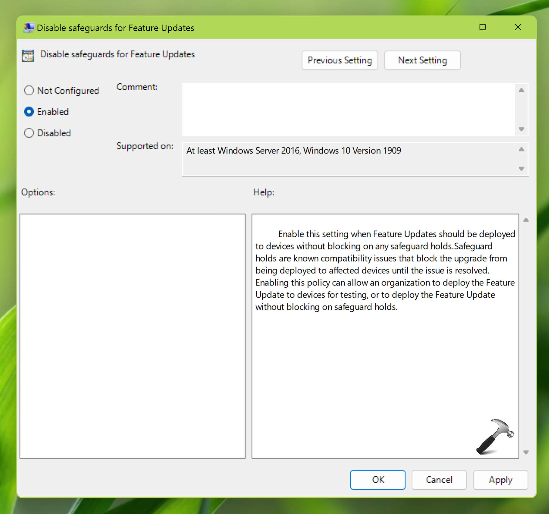 機能の更新を保持する保持は、異なる方法で有効または無効にすることができます。グループポリシーまたはレジストリを使用して構成できます。この記事では、両方のオプションについて説明します。によるとマイクロソフト、Business Deployment ServiceのWindows Updateを使用して更新を管理するIT管理者は、問題によって影響を受ける可能性が高いデバイスのSafeguard Holdの恩恵もあります。