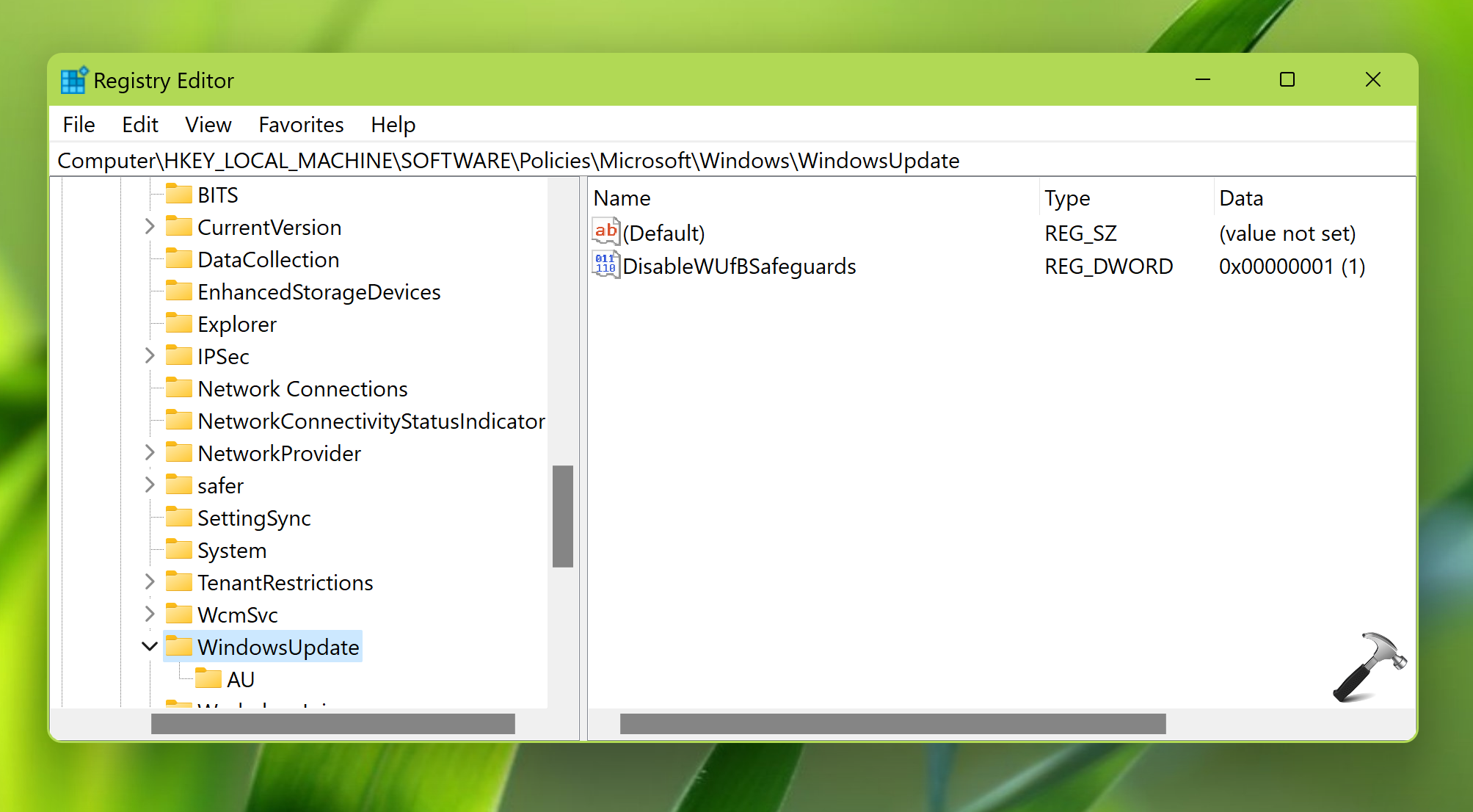 HKEY_LOCAL_MACHINESOFTWAREPoliciesMicrosoftWindowsWindowsUpdate。 - WindowsUpdateの下、セットdisablewufbsafeguardsレジストリdword(reg_dword)1に保護ホールドを無効にします。 Safeguard Holdを有効にするには、このDWORDを削除するか、0に設定します。