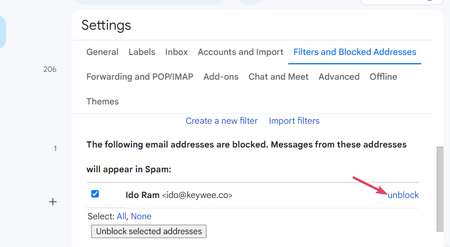 電子メールのブロックを解除する方法は、さまざまなメールサービスとアプリによって異なります。ただし、フィルター設定内でブロックされた電子メールを見つけることができます。たとえば、Gmailでクリックできます設定>すべての設定を参照してください>フィルターとブロックされたアドレスブロックされた電子メールドメインを表示します。