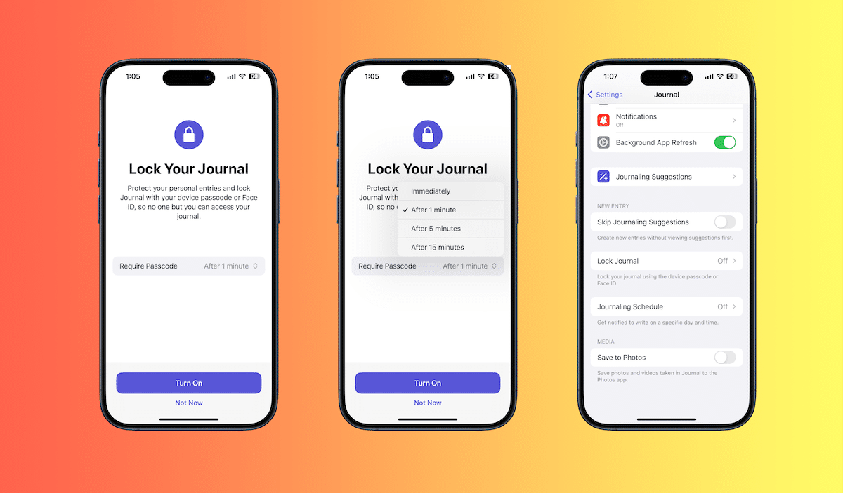- ジャーナルスプラッシュ画面をロックしますJounralアプリでは、ユーザーがアプリをロックして、こじ開けの目からエントリを保護できることを通知します。アプリをロックするオプションが設定アプリ> Jounralで使用可能であり、アプリのどこにも使用できないため、Splash画面が追加されます。