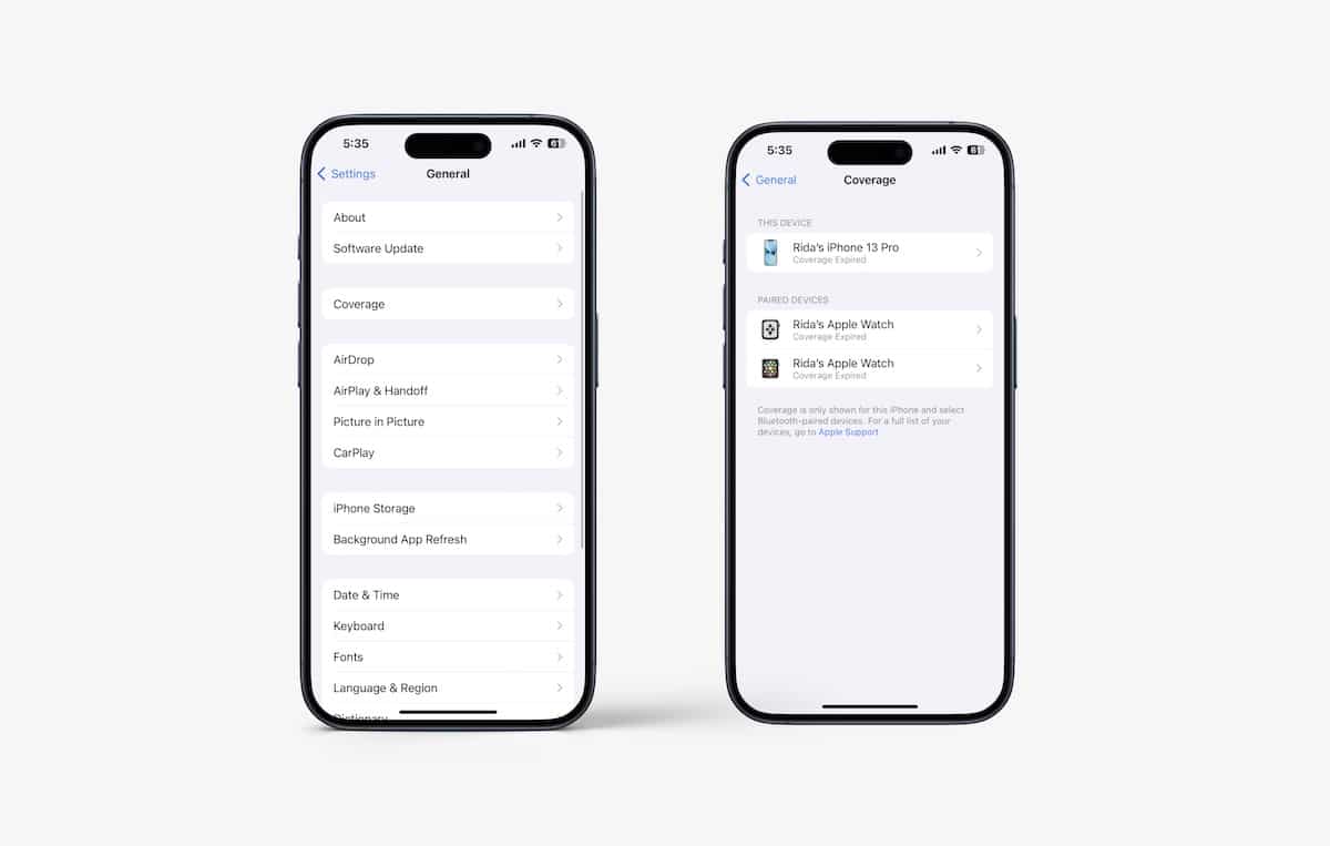 - 設定アプリの一般に新しいカバレッジセクションが追加されます。ユーザーは、AppleCare保証の下および外れているすべてのAppleデバイスに関する情報を見つけます。