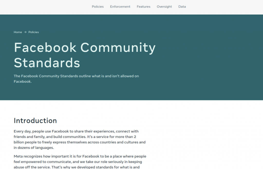 Facebookは、Facebookがすべての人にとって安全なソーシャルメディアコミュニティを維持しようとするために監視するすべての動作を概説するコミュニティ標準ページを提供しています。