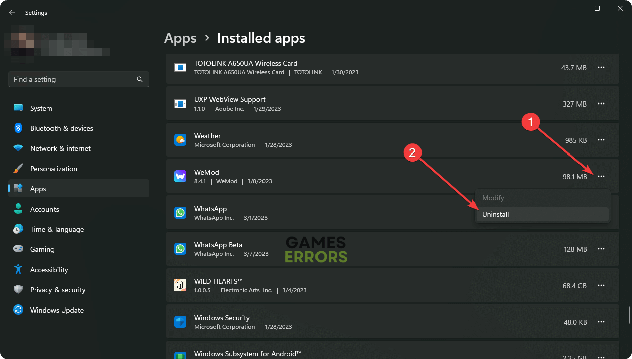 - をクリックします3つの水平ドットハッキングツールの隣で選択しますアンインストール。