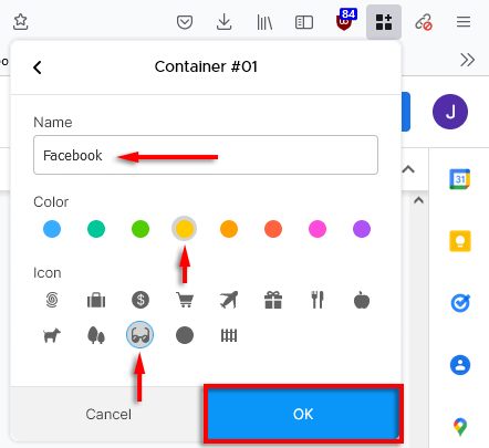 - Firefoxアドレスバーで、を選択しますマルチアクコーンコンテナはサイトアイコンを追加します。ドロップダウンメニューで、どのカテゴリを入れたいかを選択します。