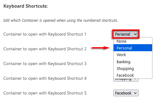 - ショートカットセクションまでスクロールして、変更するショートカットを選択します。ドロップダウンメニューで、そのショートカットに設定するコンテナを選択します。