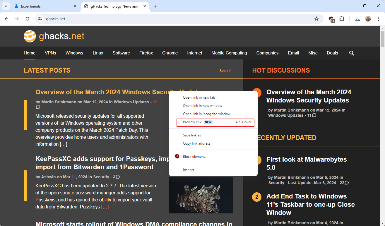 リンクプレビュー機能は、Google Chrome WebブラウザーのCanaryバージョンでデフォルトで有効になっています。使用する場合は、Alt-Keyを押し続けてリンクをクリックするか、その上にホバリングしてプレビューできるはずです。右クリックするオプションも必要に応じて利用できます。