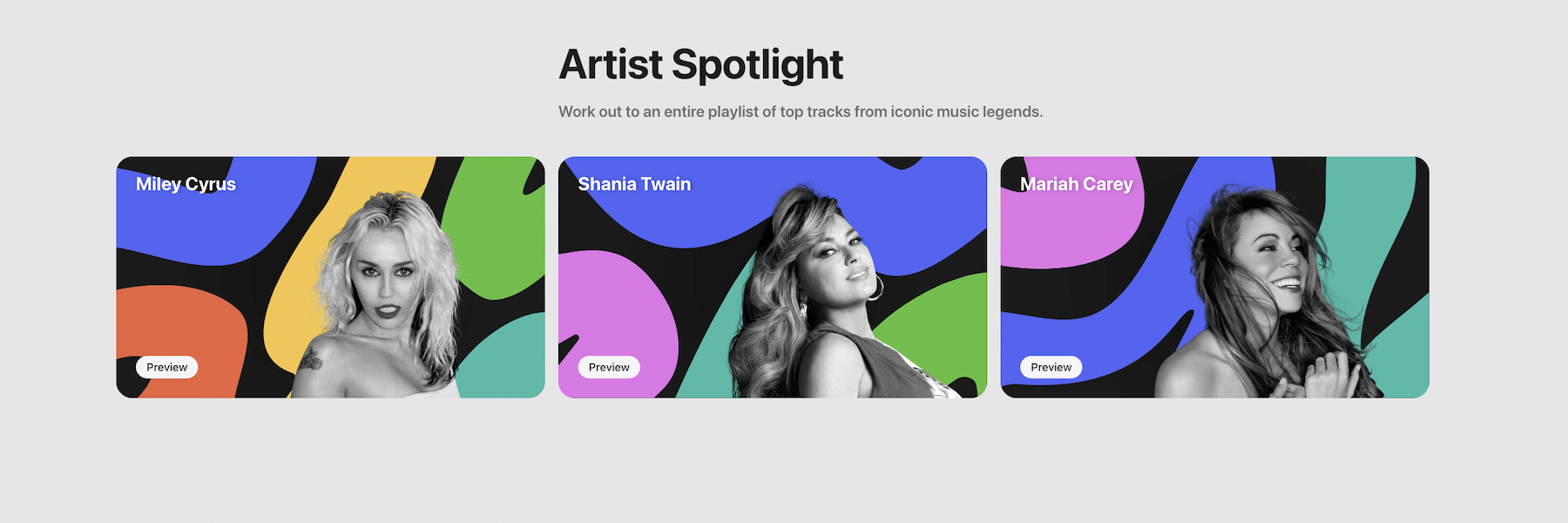 ユーザーのワークアウトセッションをより楽しくするために、このサービスには、アーティストの音楽に特化した完全なプレイリストを備えたトレーニングを含むアーティストスポットライトシリーズも備えています。