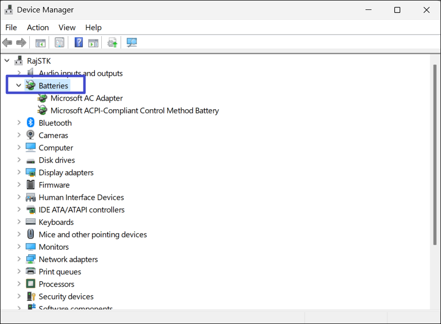 2。デバイスマネージャーウィンドウで、「」をダブルクリックします。バッテリー」それを拡張するための木。