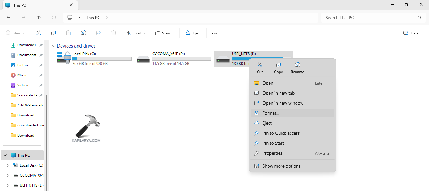 ステップ3-USBドライブを挿入します。ファイルエクスプローラーを開きます。次に、右側にUSBを表示する左側のこのPCをクリックします。
