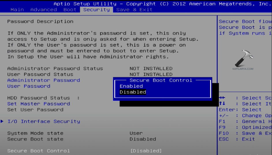 ステップ2-第二に、セキュリティ>セキュアブートコントロールに移動します。さらに、安全なブートコントロールのオプションを無効にします。