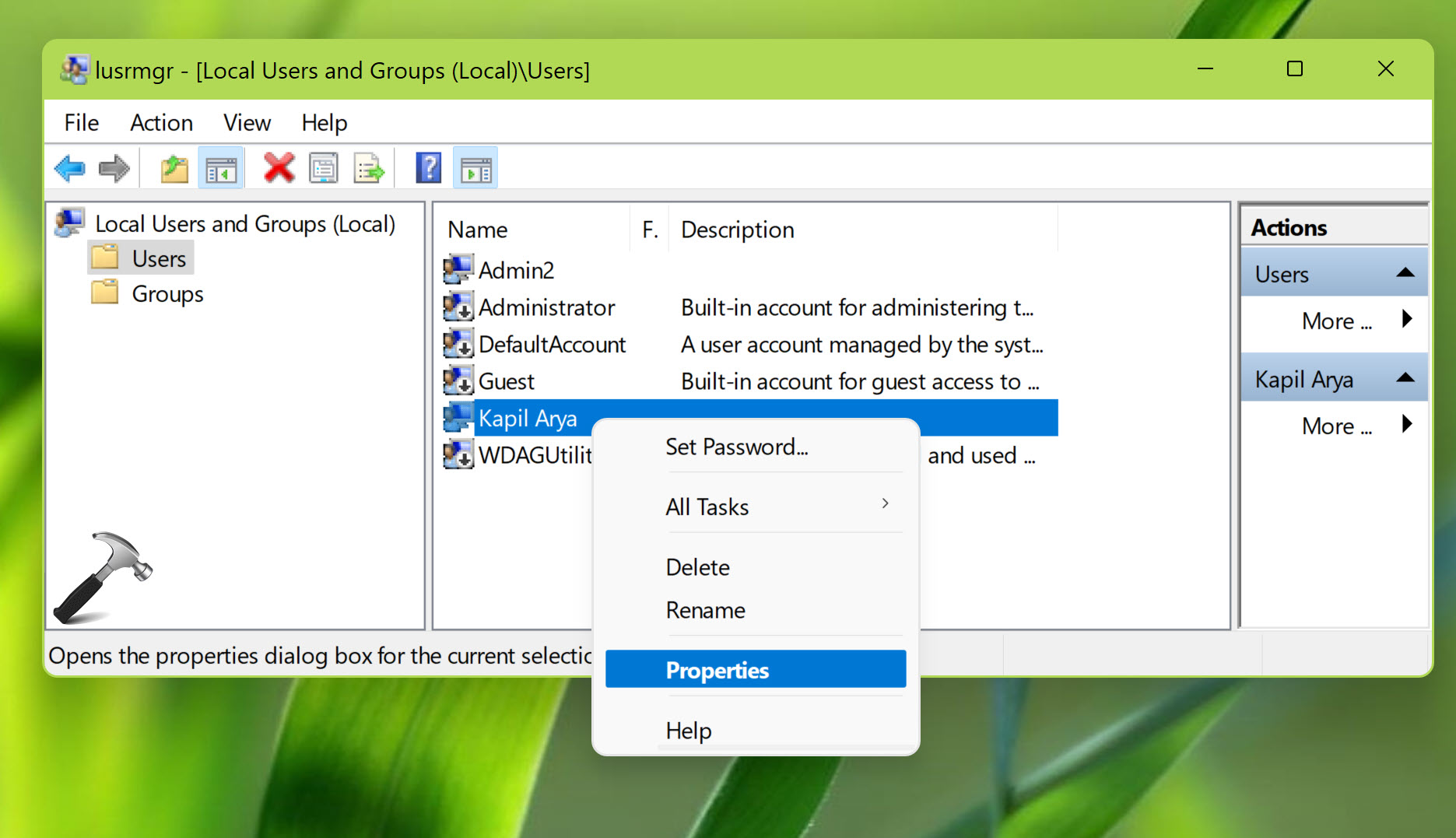 lusrmgr.msc[OK]をクリックします。 - ローカルユーザーとグループでは、スナップイン、オープンユーザーフォルダー、切り替えられない他のユーザーアカウントを右クリックします。選択しますプロパティ。