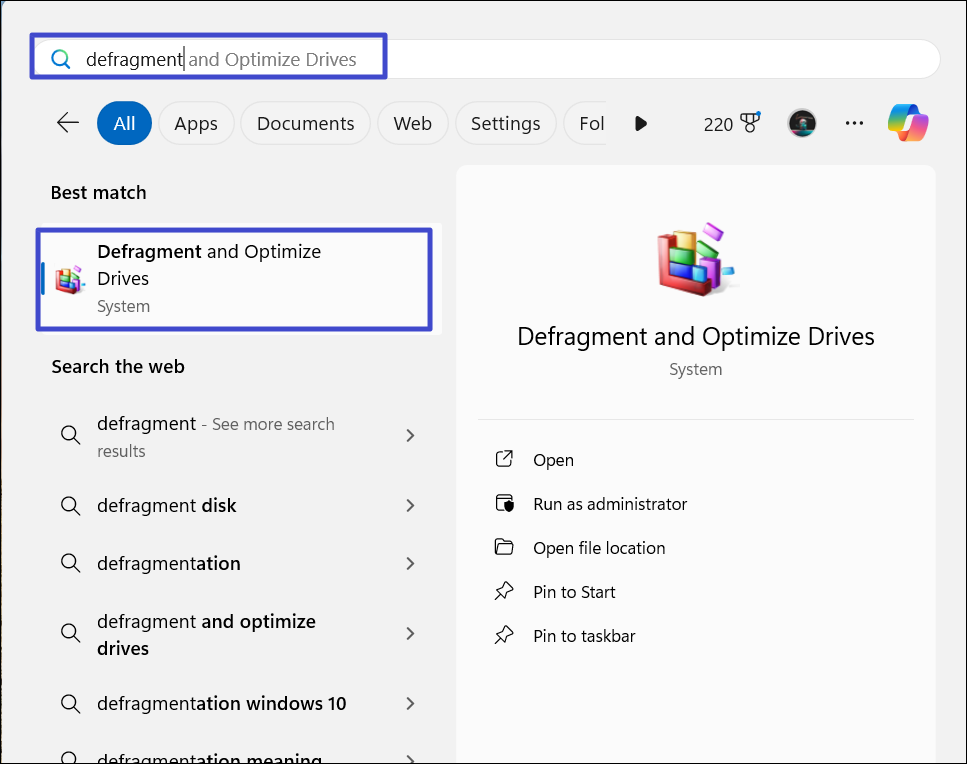 1. [スタート]ボタンをクリックし、「」と入力します。解体」検索バーで、「ドライブを解体して最適化します」結果から。