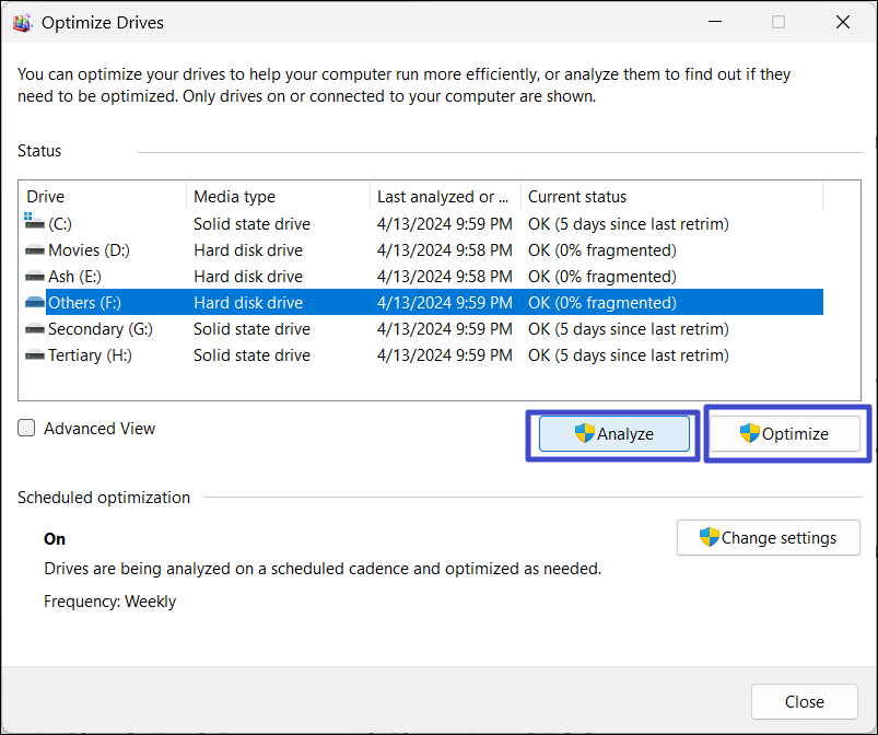 3。まず、「」をクリックします。分析します"断片化のためにディスクを分析するには。次に、「」をクリックします。最適化する」ドライブを解体する。