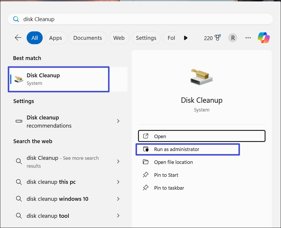 1。タイプ「ディスクのクリーンアップ」Windowsで検索して、上位の結果を選択します。