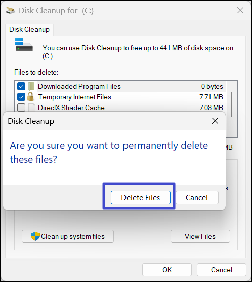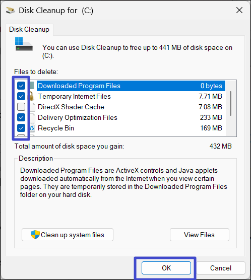 3。次に、次のように削除するファイルを選択します一時的なインターネットファイル、ビンをリサイクルします、一時的なファイル、などをクリックします。わかりました「。