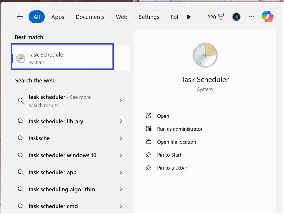 1。Windows + Sを押し、「入力」と入力しますタスクスケジューラ「、「」を選択しますタスクスケジューラ" ユーティリティ。