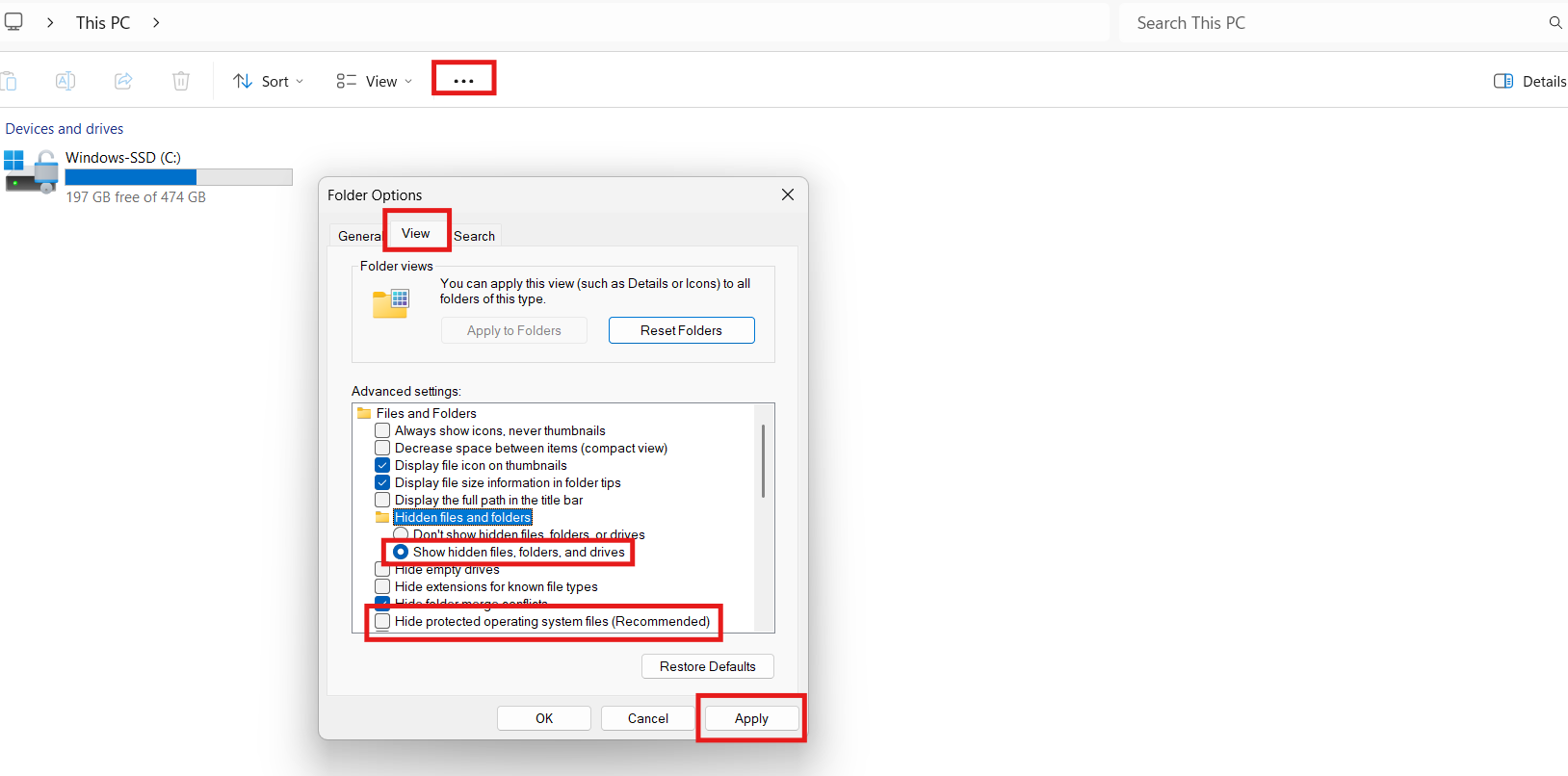 2. 表示オプションから「非表示の項目を表示」を有効にし、「保護されたオペレーティング システム ファイルを非表示にする」のチェックを外します。