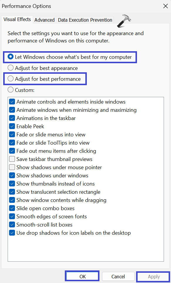 2。「」を選択します。最高のパフォーマンスに合わせて調整します" オプション。