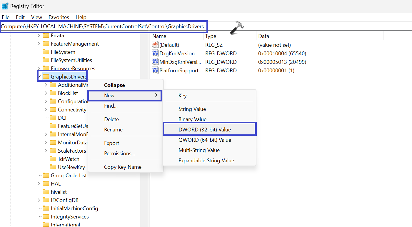 3。さて、右クリックして「」GraphicsDrivers」選択を選択します。new => dword(32ビット)値「。