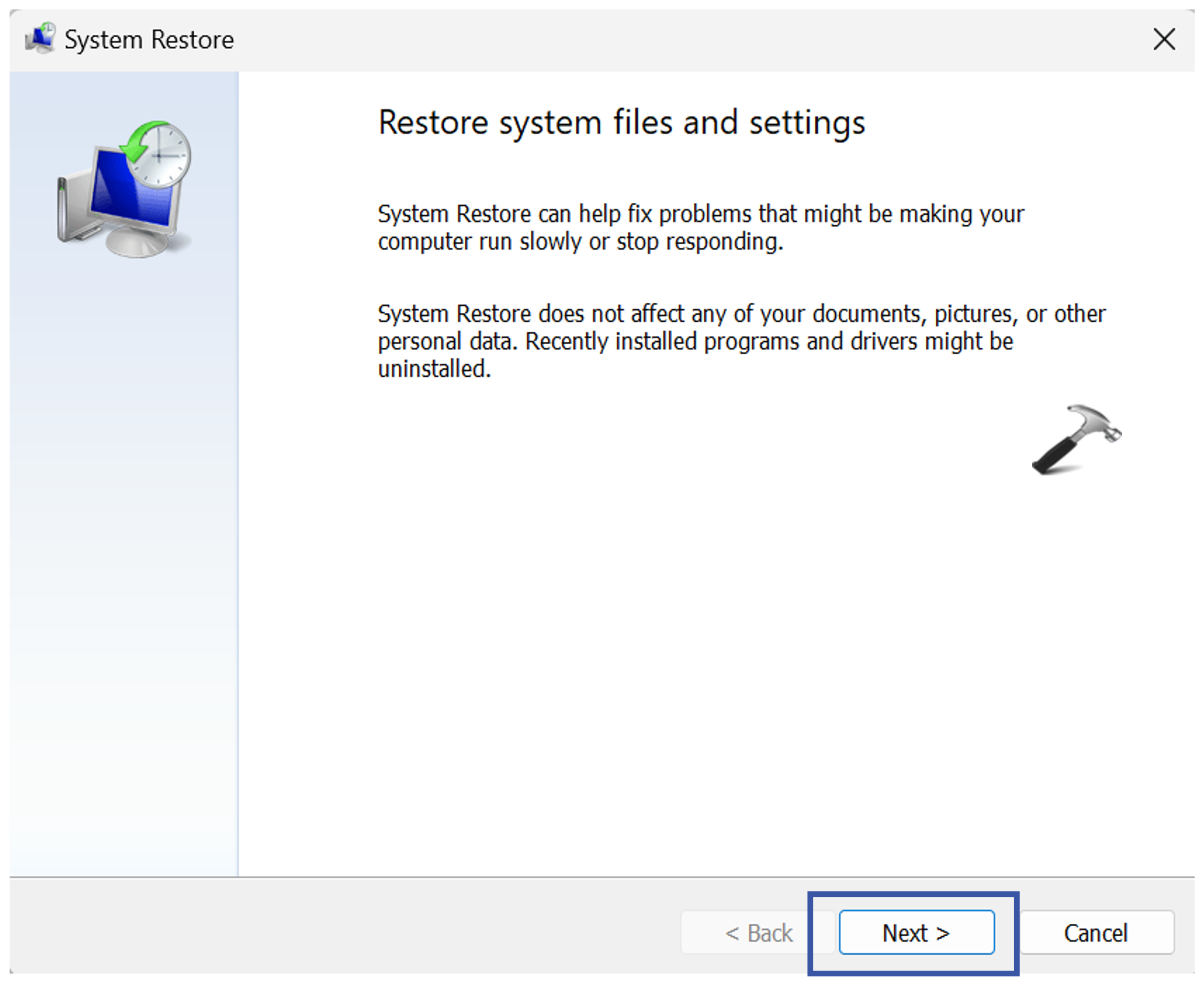 システムの復元は、選択した復元ポイントにコンピューターを復元します。これにより、復元ポイントが作成された後にインストールされたアプリ、ドライバー、または更新を削除します。