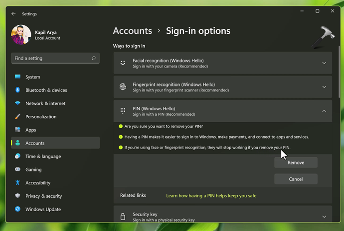 Windows Hello Pinは、Windows Helloで使用できる生体認証機能のいずれかの基本的なニーズです。通常、PINは、これらの生体認証が機能しない場合に備えてバックアップ機能を提供します。したがって、顔の認識が機能していない場合、その理由はあなたのピンが機能していません。これを確保するために、既存のピンを取り外してからもう一度セットアップします。ピンを取り外すと、既存の顔認識が削除されるため、顔認識を再度設定する必要があり、今回は予想どおりに機能する可能性があります。