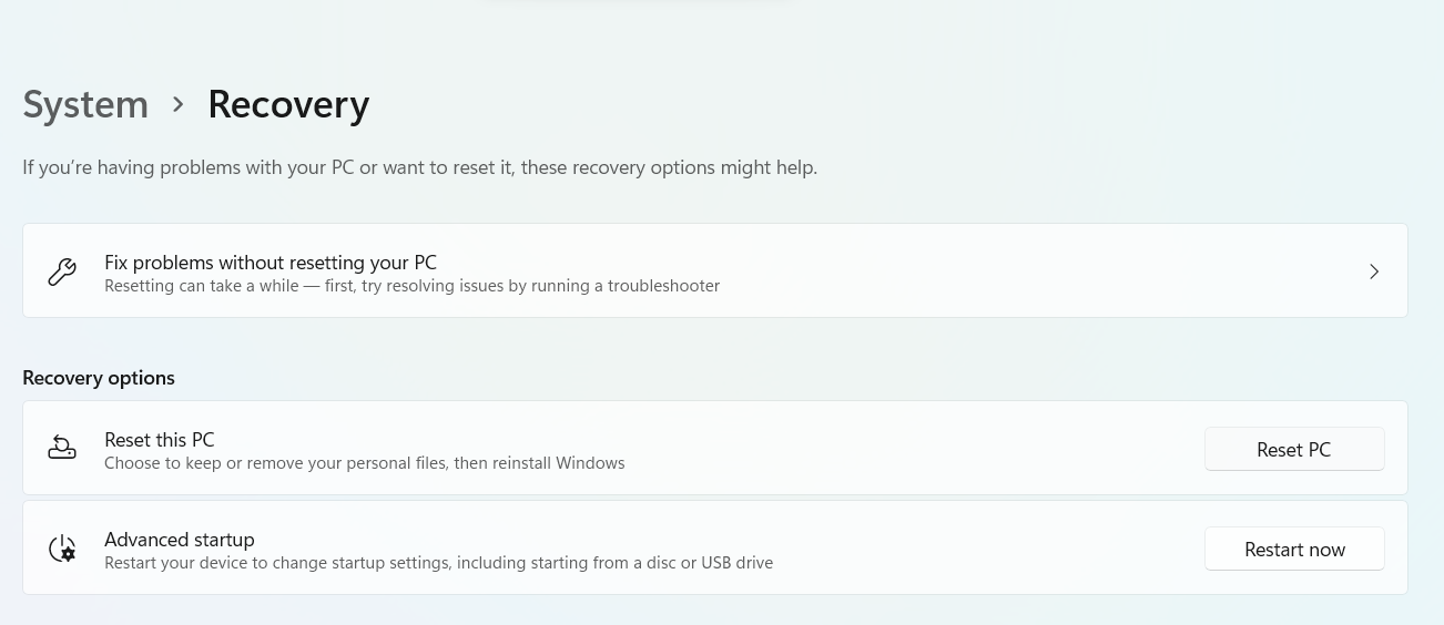 上記のオプションのいずれも問題を解決しない場合。 Windowsオペレーティングシステムをリセットする必要があります。以下の手順に従って、システムをリセットしてください。