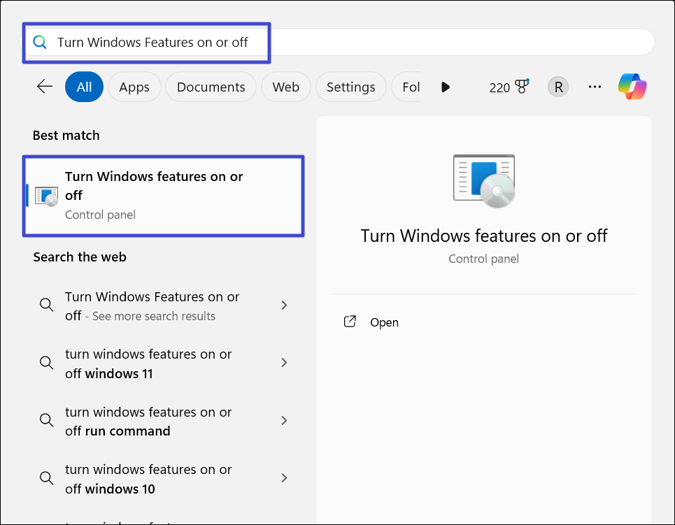 1。「」を検索しますWindows機能」Windowsで検索して選択します。Windowsの機能をオンまたはオフにします「。