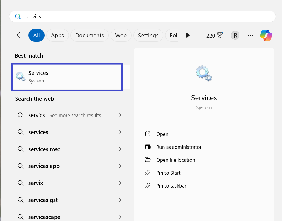 1。Windowsキーを押し、「」と入力します。サービス「そして、最良の結果を選択します。