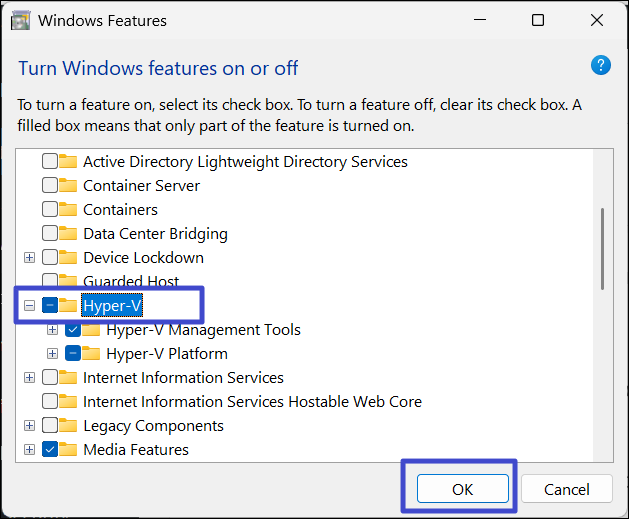2。「」を見つけて確認します。Hyper-V」オプションとクリックわかりました「。