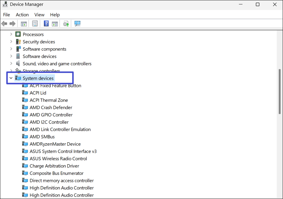 2。[デバイスマネージャー]ウィンドウで、下にスクロールして「」をクリックします。システムデバイス」それを拡張するために。