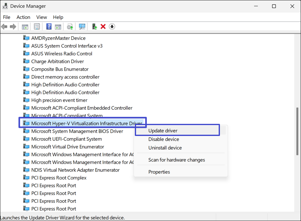 3。システムデバイスカテゴリの下で、「」を見つけて右クリックします。Microsoft Hyper-V仮想化インフラストラクチャドライバー「。それから、選択」ドライバーを更新します「。