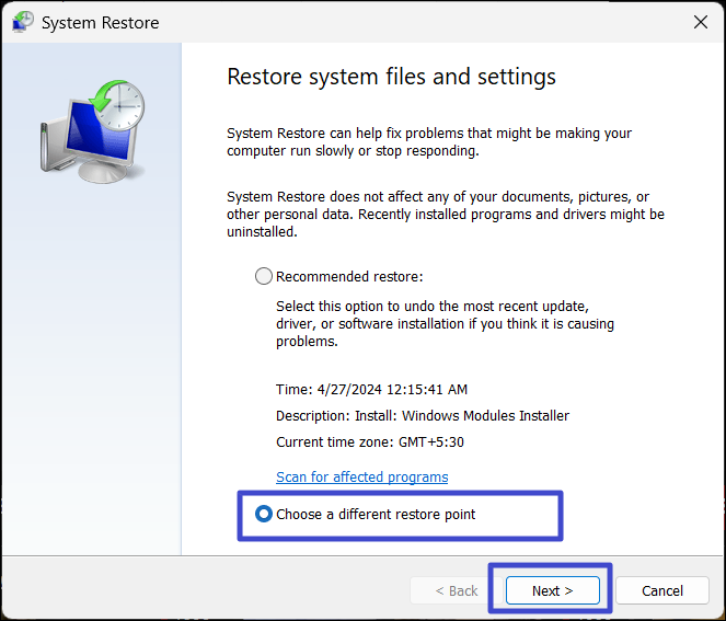 2。システムの復元ツールで、「」を選択します。別の復元ポイントを選択します」オプション、そしてクリックします」次「。