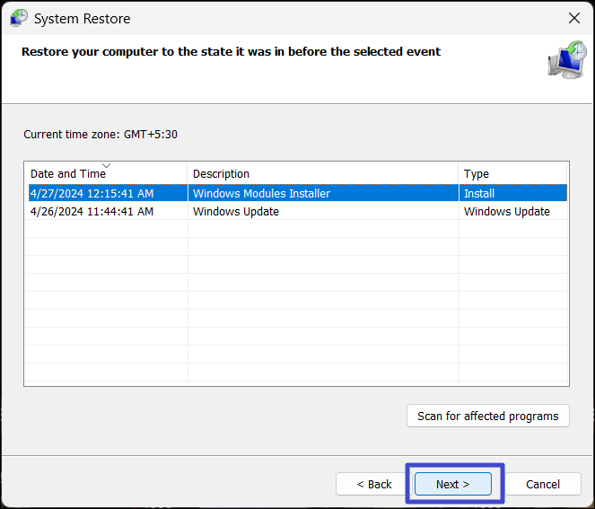 3.最新の復元ポイントを選択して、「」をクリックします。次「。