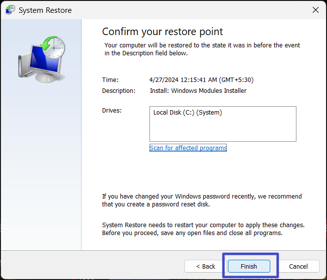 4。最後に、「」をクリックします。仕上げる」PCを再起動します。
