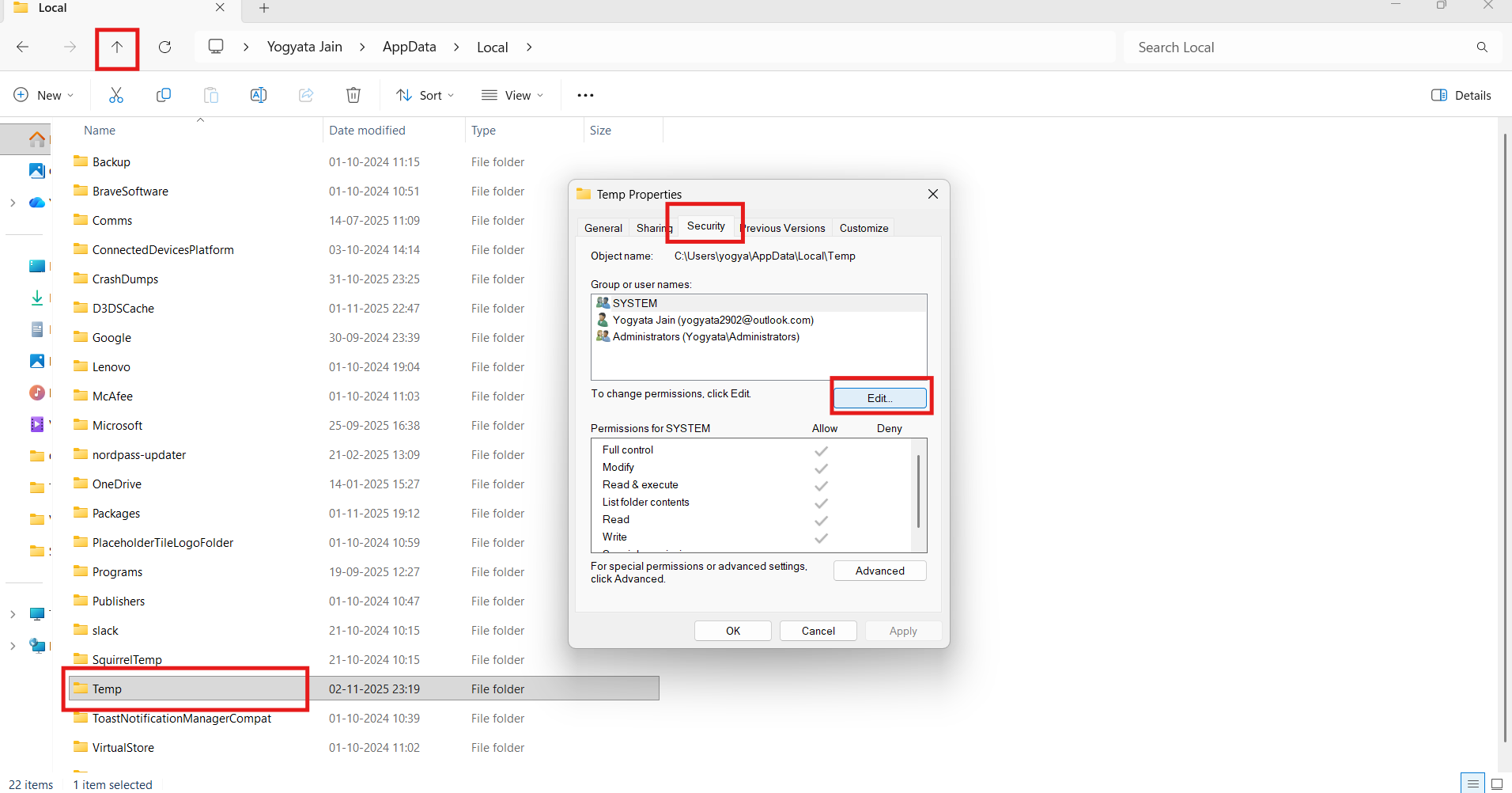 解決策 1: Temp フォルダーのアクセス許可を変更する