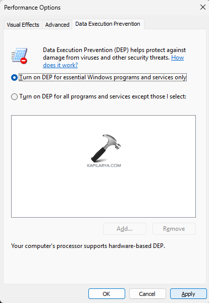 ステップ3-次に、必要に応じて、必須のWindowsプログラムとサービスのみでDEPをオンにするか、すべてのプログラムのDEPをオンにします。