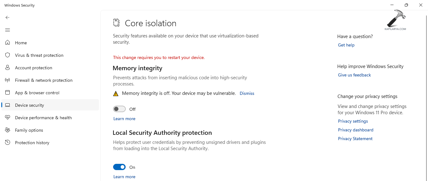 ステップ1-最初は、Windowsセキュリティを開きます。次に、[デバイスのセキュリティ]> [コア分離の詳細]> [メモリの整合性]をクリックします。