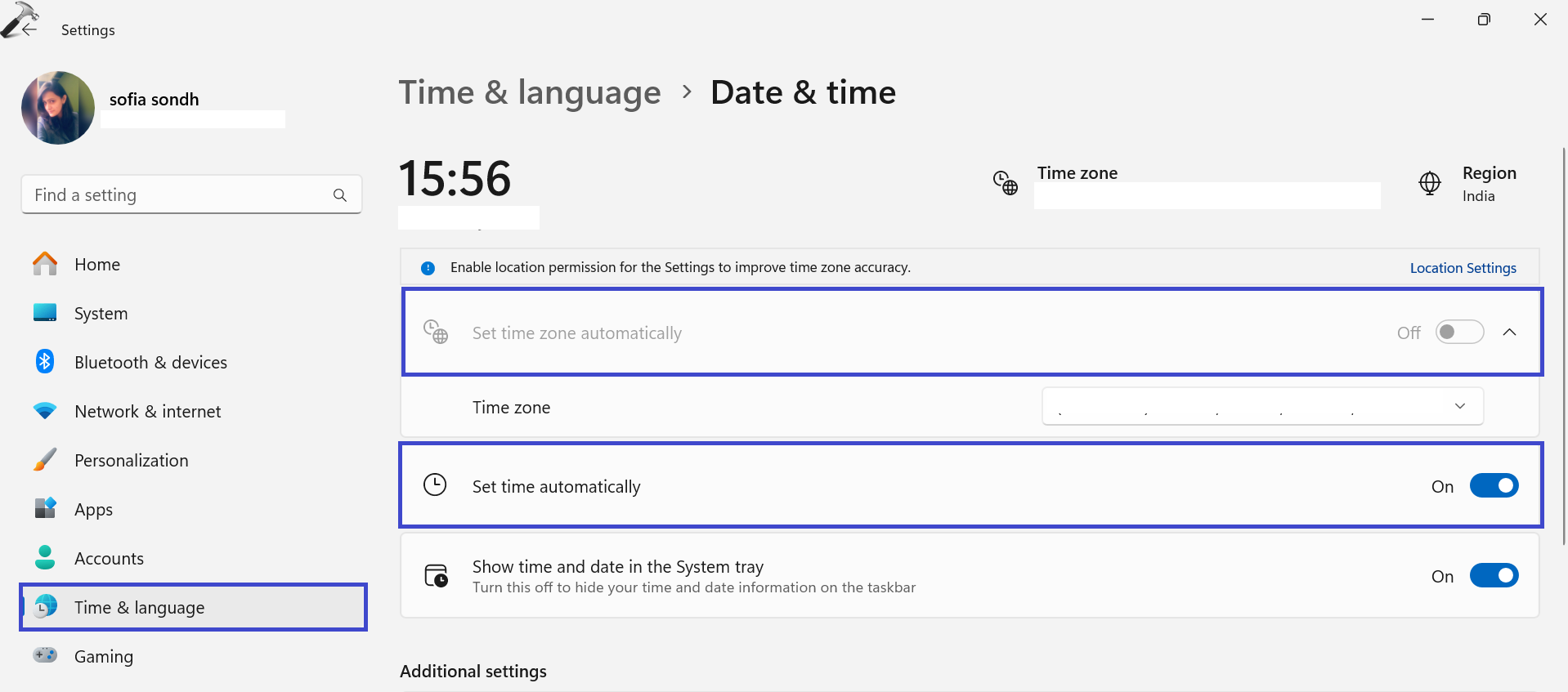 以下の手順に従って、「自動的に設定された時間」と「タイムゾーンを自動的に設定する」オプションを有効にして、デバイスのクロックが正確に同期されるようにします。