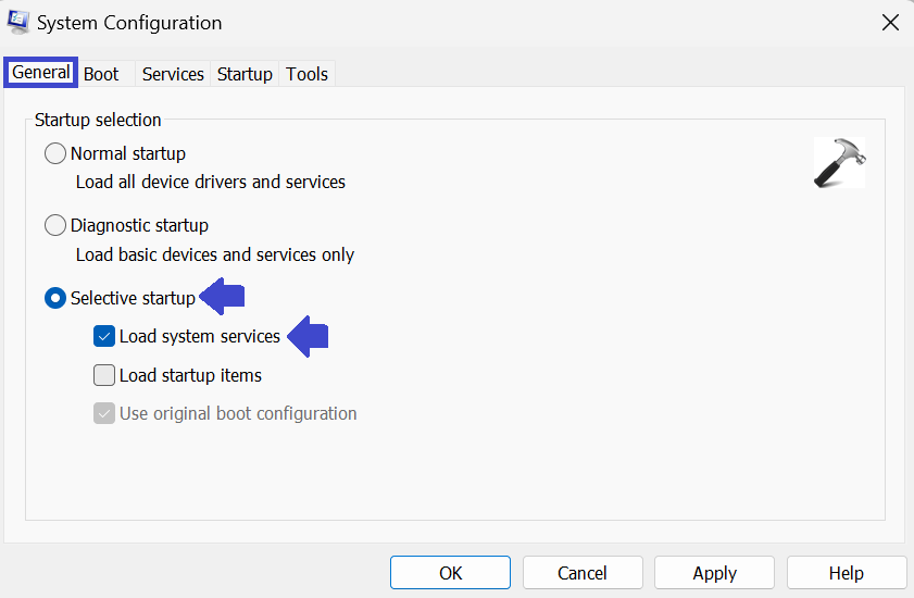 2。に行きます一般的な[タブ]と[]を選択します。選択的な起動「。