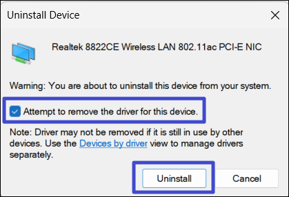4。「」をチェックしてくださいこのデバイスのドライバーを削除しようとする」オプションとクリックします」アンインストール「。
