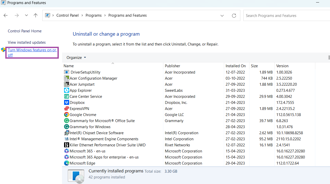 - 開けるWindows機能のオンまたはオフFix 1で与えられたのと同じ手順に従ってウィンドウ。