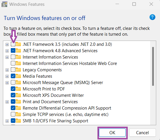 - 選択解除.NETフレームワーク3.5>クリックしますわかりました。
