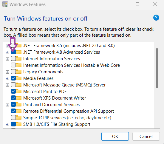 - 選択解除.NETフレームワーク4.8高度なサービス箱。 (それは.NETフレームワーク4.6以降よりも高い場合があります)[OK]をクリックします。