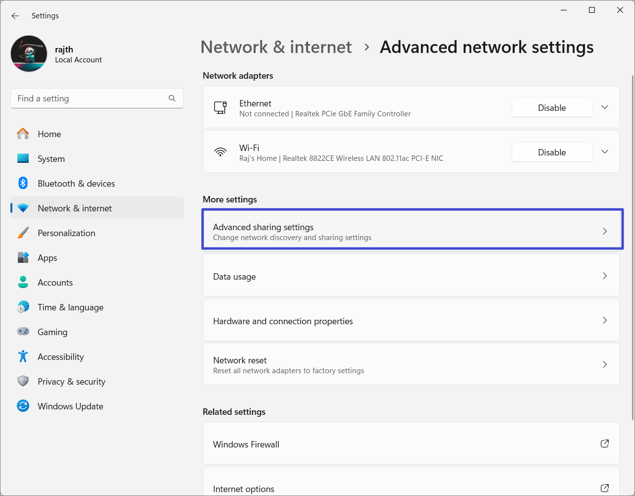 1. Windowsの設定を開いて「」に移動します。ネットワークとインターネット」> "高度なネットワーク設定」。