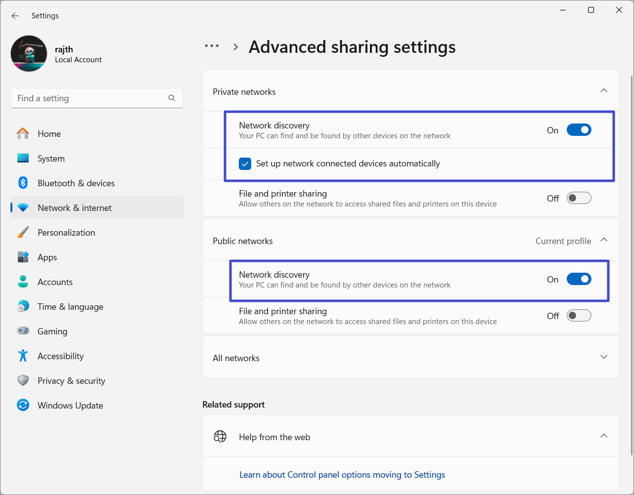 4。ネットワーク発見」トグルがオンになり、「」を確認します。ネットワーク接続デバイスを自動的にセットアップします" オプション。