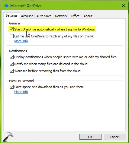 2。Microsoft OneDriveウィンドウで、下設定タブ、一般的な見出しがあります。これで、確認してくださいWindowsにサインインすると、OneDriveを自動的に開始しますOneDriveがWindows 10デバイスから開始できるようにするオプション。クリックわかりました。