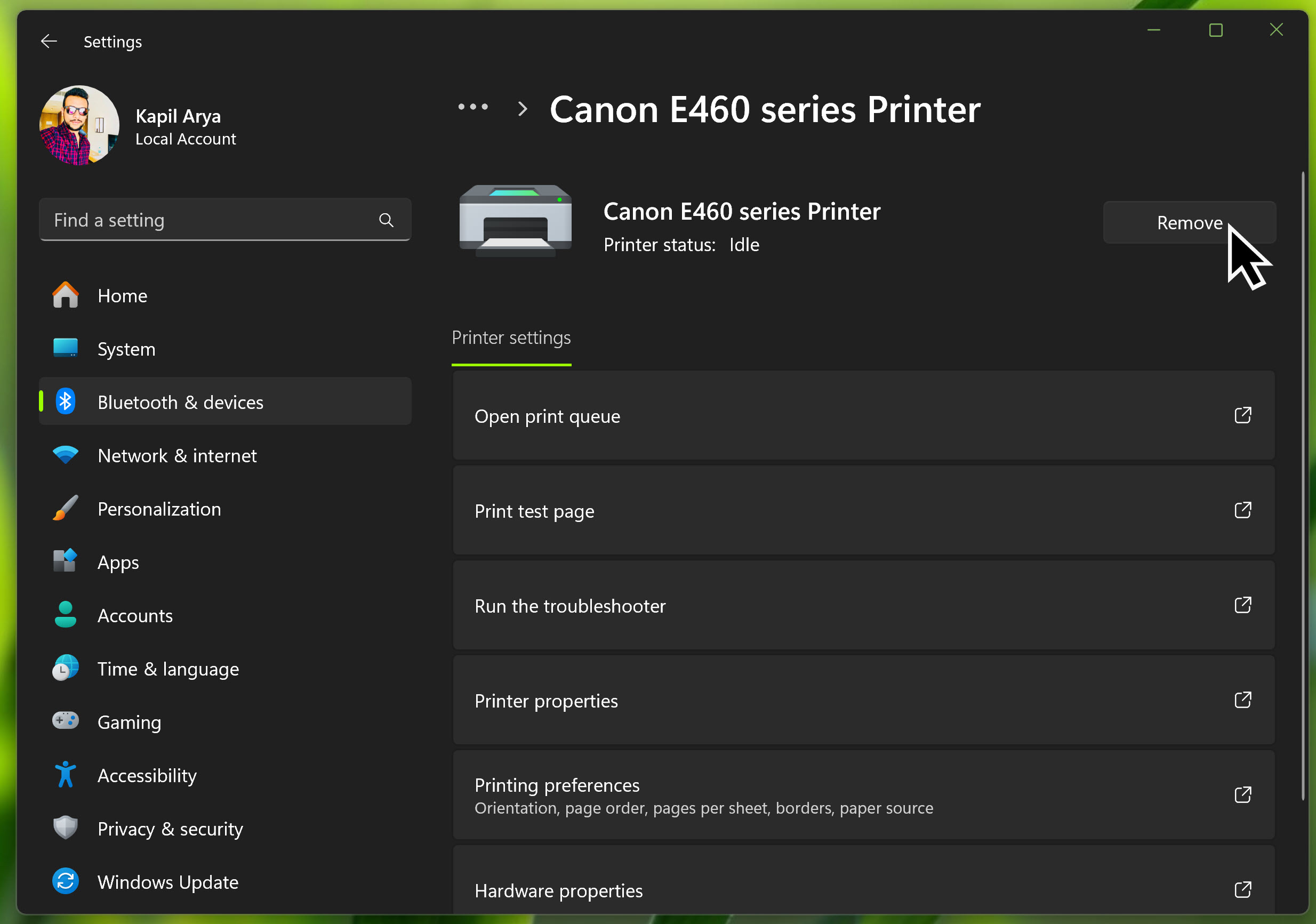 設定アプリを開き、Bluetoothとデバイス>プリンター>プリンターを選択します。
