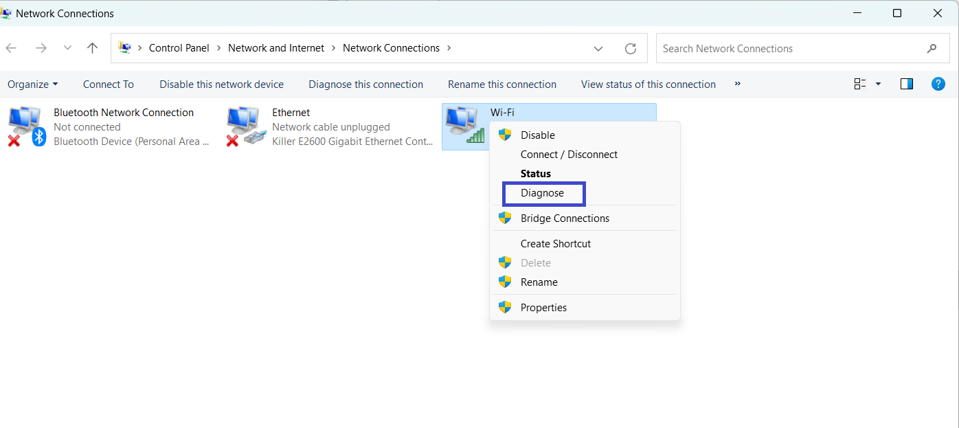 2。Wi-Fiを右クリック>診断を選択します。