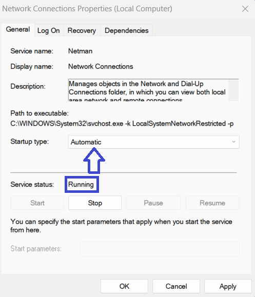 6.サービスステータスが実行されているはずです。 [開始]をクリックしない場合。