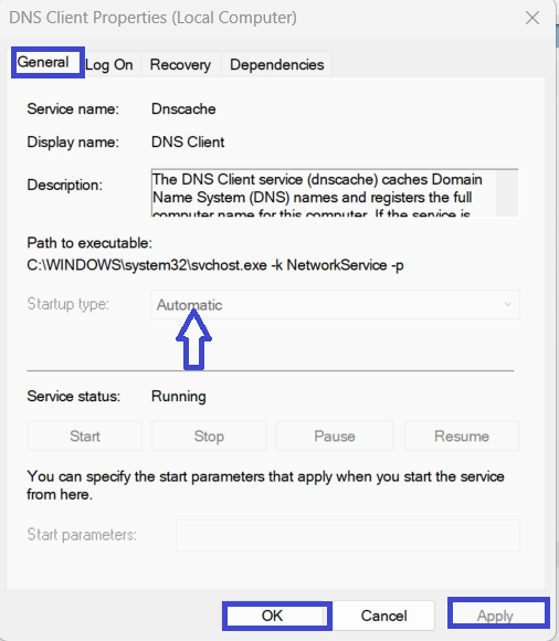 6. [一般的なタブ]> [起動]タイプを自動に設定します。